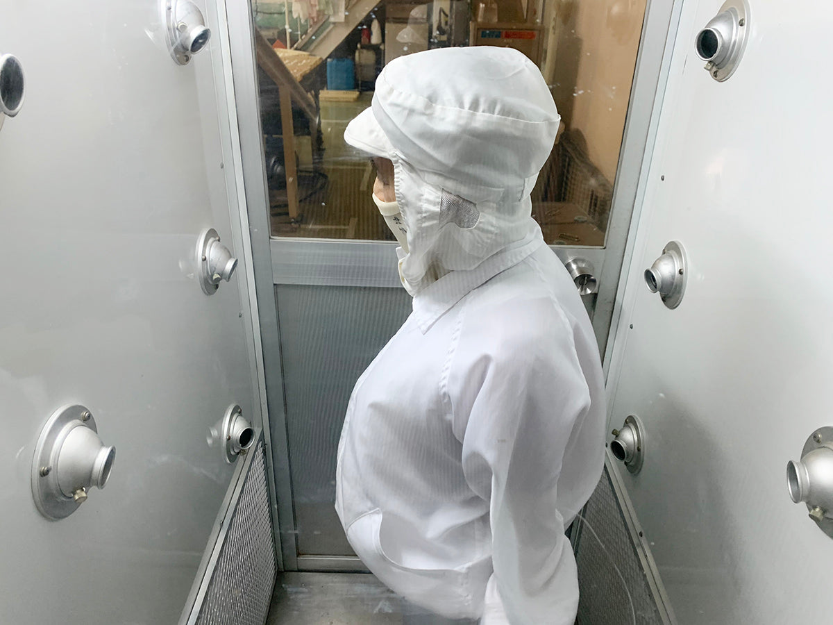 クリーンルーム入室時はエアシャワーを用いて衣服に付着しているホコリや髪の毛を取り除きます。
